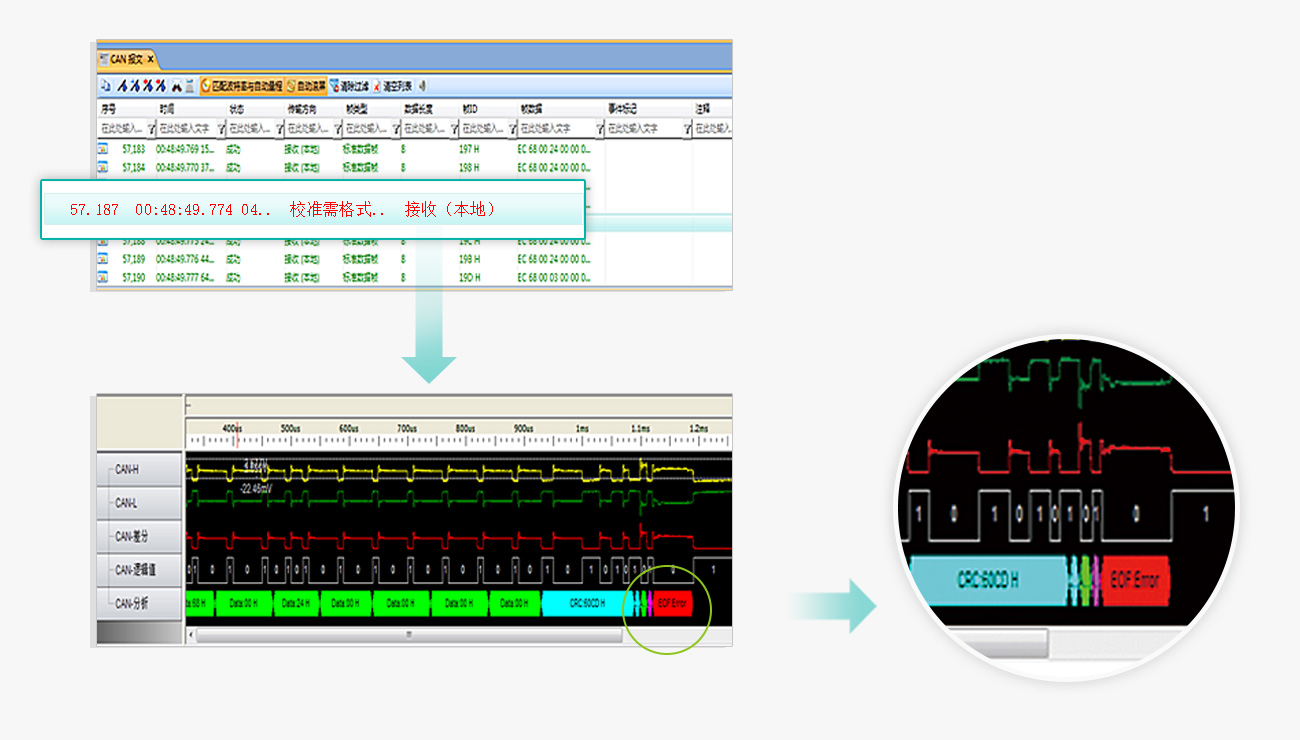 新能源汽車主機廠和零部件企業在CANDT一致性測試后,對于測試報告中顯示測試不通過的問題,可以用CANScope進行故障定位和排查,加快CAN總線穩定的研發速度。