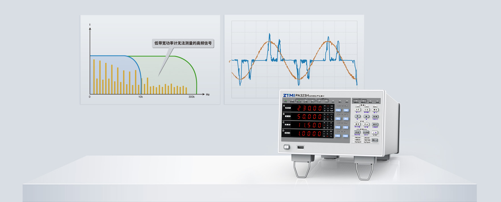 在面對存在畸變的信號時,普通功率計因帶寬與采樣率的限制,無法測試其中高頻諧波分量,測量值與真實值存在巨大差距。PA323H數(shù)字功率計具有300KHz帶寬,能夠涵蓋畸變波形中的高頻諧波分量,準確測量其功率因數(shù)及功率。