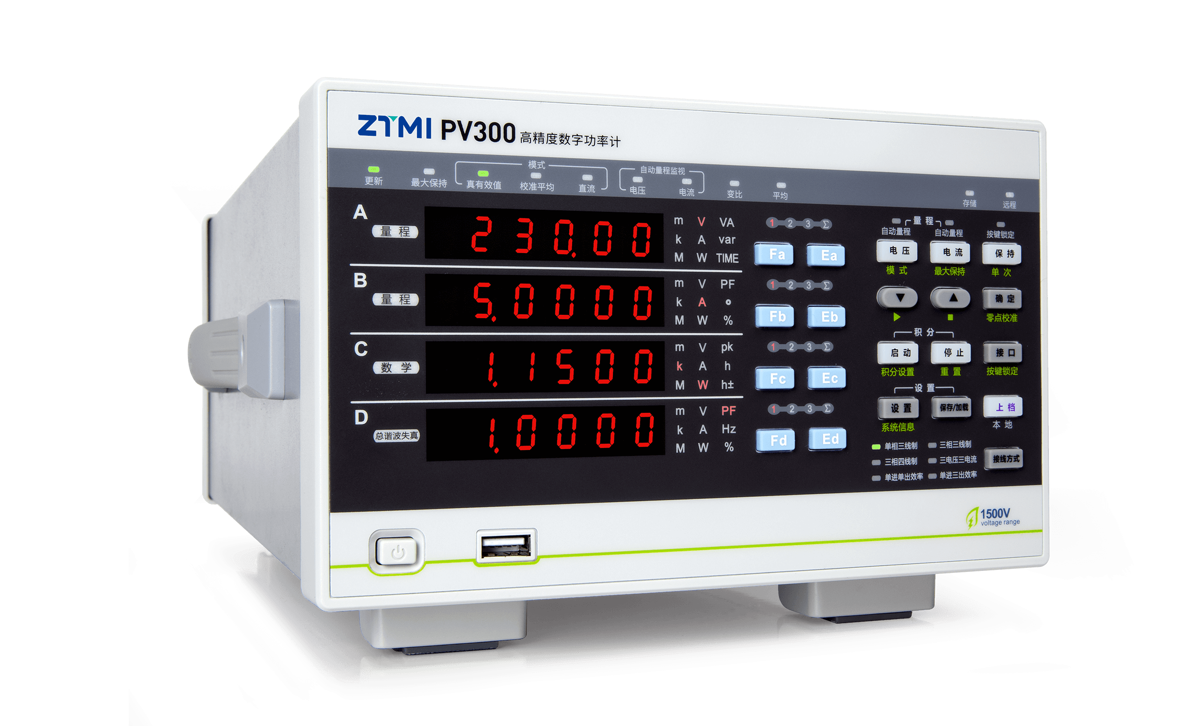 PV300高精度數字功率計,具有0.1%的功率測量精度,可滿足用戶50A大電流的測量需求;并采用DSP + FPGA 雙核處理架構,快速、精確地計算信號各相參數,同時具備以太網、RS-232、USB、GPIB等接口滿足用戶不同的系統集成測試通信需求。
