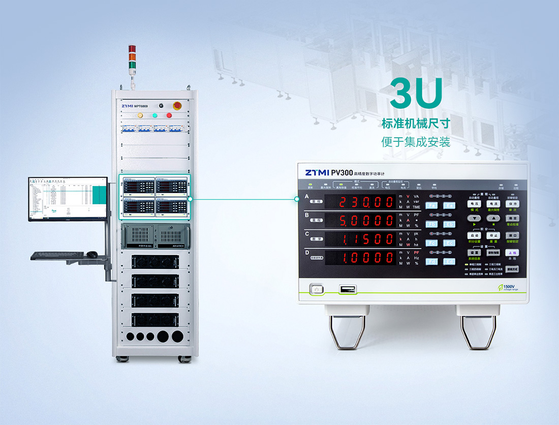 PV300功率計支持三通道信號測量,支持1000V電壓和50A電流直接測量,功率范圍廣。其機身為3U標準機械尺寸,方便集成安裝,同時標配多種通信接口,提供豐富的開發例程,廣泛應用于逆變器生產測試平臺、電源生產測試平臺。