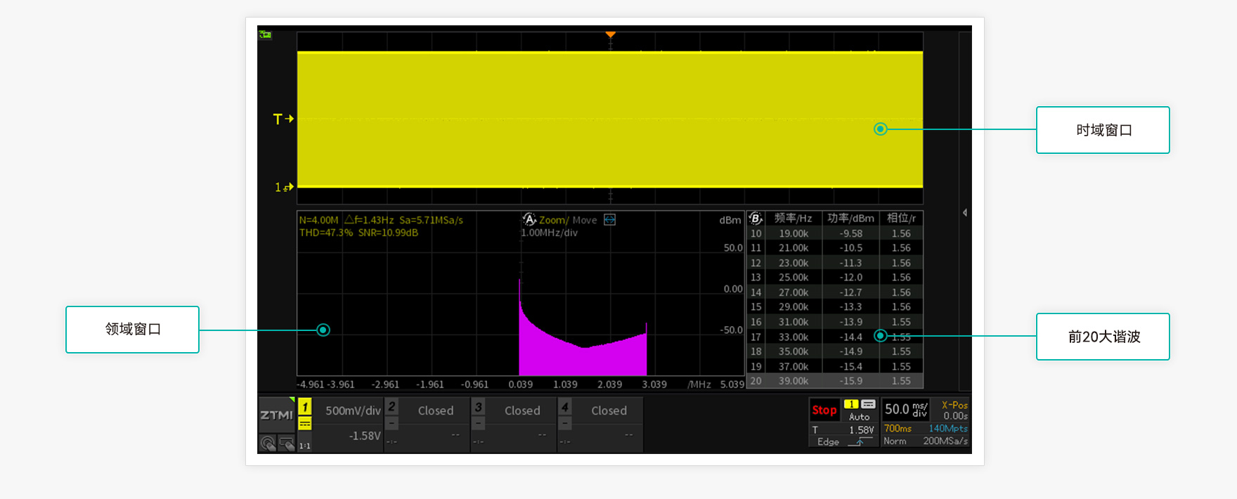 市面上多數2000系列示波器最大只支持8K樣本點的FFT分析,在1G采樣率的情況下,頻率分辨率僅有125KHz,多數情況都無法準確判斷信號頻譜分布。ZDS3000/2000B系列示波器拒絕單純的功能堆砌,內部采用了專業的處理芯片,突破技術壁壘,將FFT分析點數升級至4M樣本點,同樣在1G采樣率的情況下頻率分辨率能精確到250Hz,可以準確分析出電路中的干擾噪聲來源,大大提高了示波器FFT的實用價值。4Mpts FFT分析功能,不僅僅是在量上突破,而且還是在質上的飛躍。