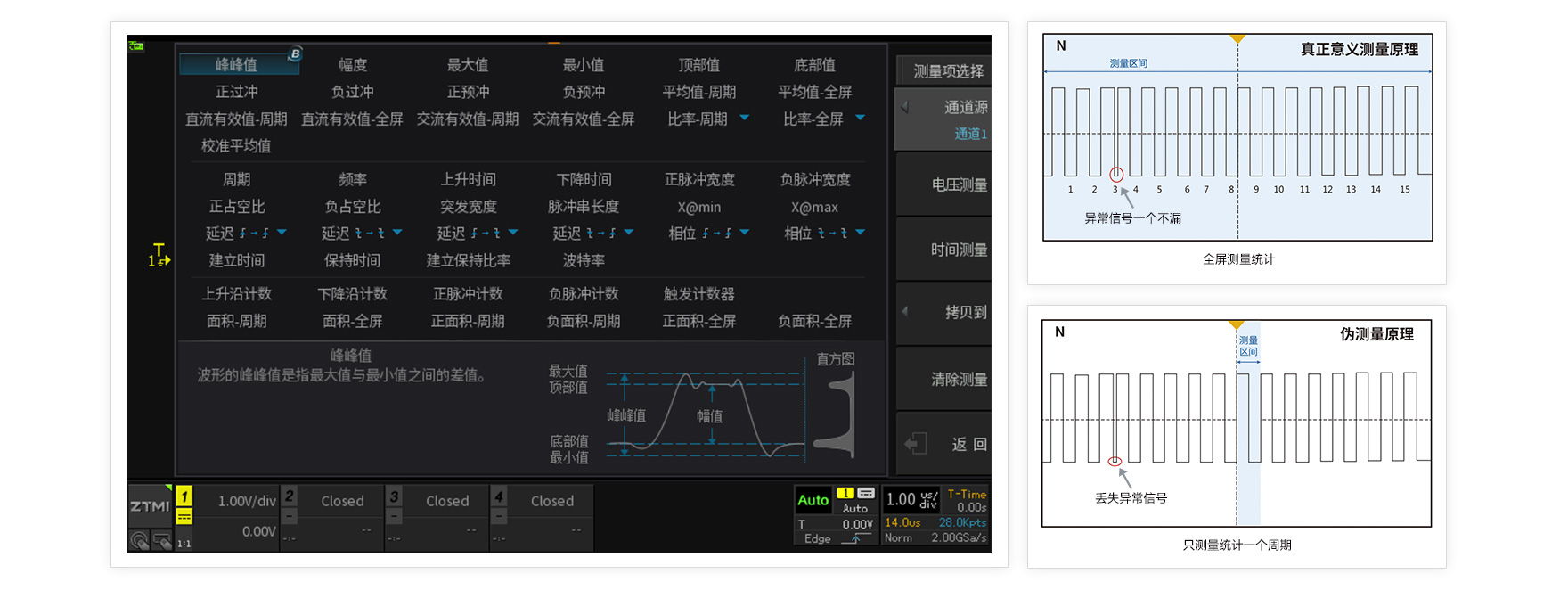 僅僅通過波形的直觀表現來分析波形遠遠不夠,只有將波形各項指標精確量化,才能看透波形異常的本質。然而受限于架構和芯片限制,絕大多數示波器的參數測量都是基于采樣結果進行抽點,無論屏幕中有多少個信號周期,都僅僅抽取每屏中的一個周期信號進行統計測量,這也直接導致了結果的嚴重失真。為了實現意義的參數測量統計,我們采用FPGA進行全硬件加速,通過對屏幕上每一個周期信號的測量,計算出每一項指標的最大值,最小值,平均值,標準差,實現了意義參數測量功能,并且多達50余種。