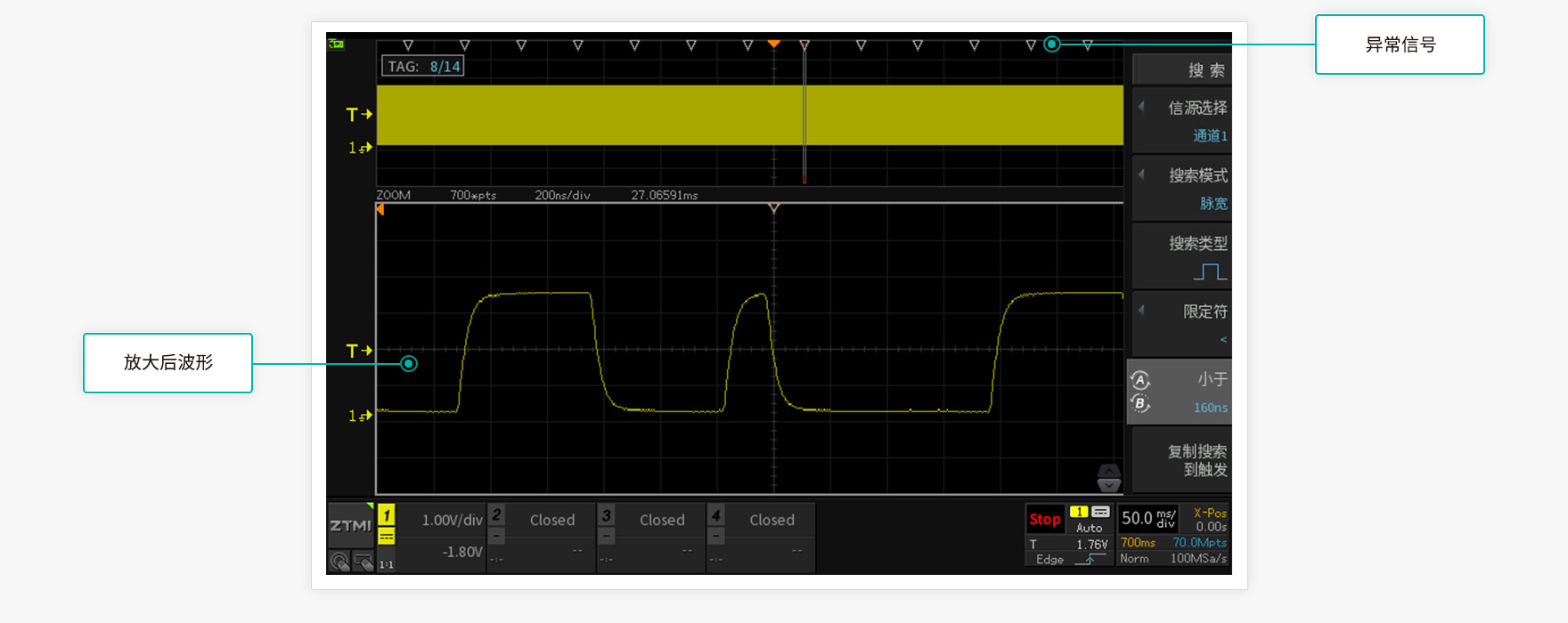在調試信號波形時,我們需要明確信號是否出現了異常。如果出現了異常,那這些異常信號出現的頻率是多少,是不是周期性出現的呢?為了弄清楚這些問題,一般需要長時間記錄波形,然后基于這樣一個龐大的波形數據庫去定位異常波形出現的位置。ZDS3000/2000B系列示波器依托于海量存儲和硬件加速的優勢,能夠從數十萬個波形中迅速定位出感興趣的信號,只要當前屏幕內出現了符合搜索條件的波形信號,系統都將自動地在對應位置做上標記,異常信號一覽無余。