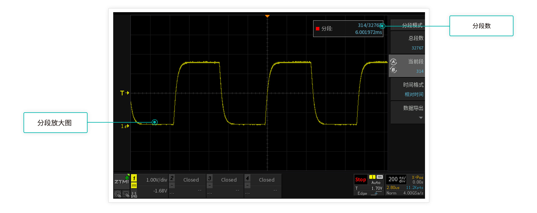 存儲深度等于采樣率乘以采樣時間,512M大存儲深度,長時間捕獲波形,依然不會出現波形失真。