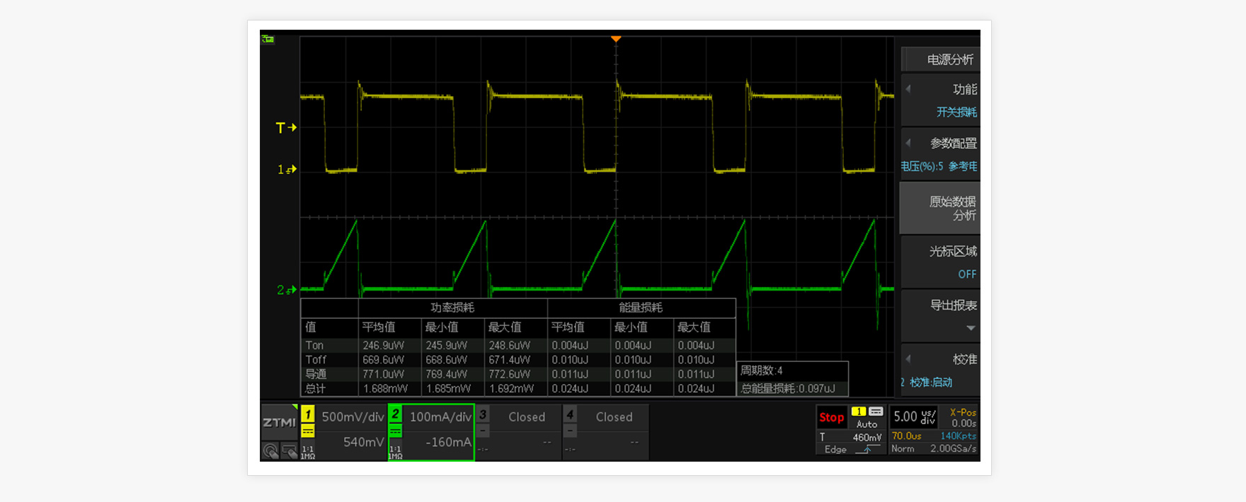 功率MOSFET開關損耗測試是PFC電源調試中的難點,由于SPWM每個周期的開關損耗都不相同,傳統通過手光標和數學運算手動測試的方式已經不適用。ZDS5054A示波器標配250Mpts存儲深度,可捕獲多個完整調制周期SPWM波形,自動統計各開關周期的開通/關斷/導通損耗,計算最大值、最小值、平均值,準確量化開關器件的功率損耗。