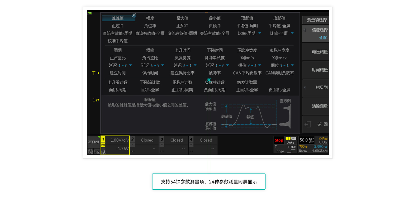 支持54種參數的全屏測量統計,通過FPGA并行計算全部波形的最大值,最小值,平均值,標準差,最多可同時顯示24種參數,計算全程僅需1秒鐘。